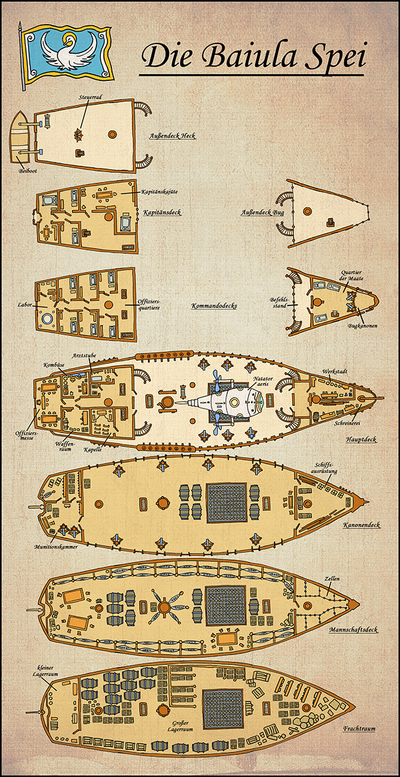 Mit der „Baiula Spei“ wurde das Tauchboot Natator aeris mit einem Kran verladen und zu seinen Einsatzorten im Meer transportiert. Als Kapitän der Baiula spei wurde der Graf Dogerian von Koslin, ehemaliger Admiral der perlheimer Flotte und Experte für die Bartha-Bucht, eingesetzt.