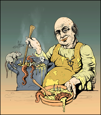 Beim Essen stopfte Kaltfisch sich einfach hemmungslos den Bauch voll und zog alle Register des schlechten Benehmens. Er griff mit den Händen in die Schalen und ließ seinen Teller links liegen. Er schnäuzte neben den Tisch und, als er seine Schuhe unter dem Tisch auszog, machte sich ein säuerlicher Geruch breit, der von Kaltfischs Füßen stammte. Der Pirat rülpste, furzte und schien auch die Funktion von Gabel und Messer nicht zu kennen, sondern sah nur ihren Wert und steckte sie ein.