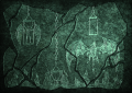 Eingangstür des Archivs mit einem Abbild des Phanon (Nr.27) Der Text lautet übersetzt: „Preise die Macht des linken Pfads!“ und weiter: „Ehre dem geteilten Arkis! Seine Linke ist Schatten, Schatten ist Leid, Leid ist die Waffen der Macht, die Macht ist unser, möge die Welt erzitttern!“