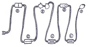 Die Kammer hat einen schmalen, knapp zwei handbreiten Spalt in der Mitte. An der gegenüberliegenden Wand befinden sich eine verschlossene Tür und sieben Löcher mit Zeichen daneben. In jedem Loch befindet sich ein Griff, welcher gedreht werden kann.