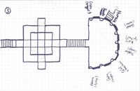 Ein kleines Zeichen, welches eine eckige Version zu einem Schutzkreis darstellt, und ein großer Beschwörungskreis sind auszumachen. Ein großer Dämon steht im großen Kreis und bewacht anscheinend die Tür am Ende des Raumes. Die Tür lässt sich nur mit größtem Kraftaufwand öffnen.
